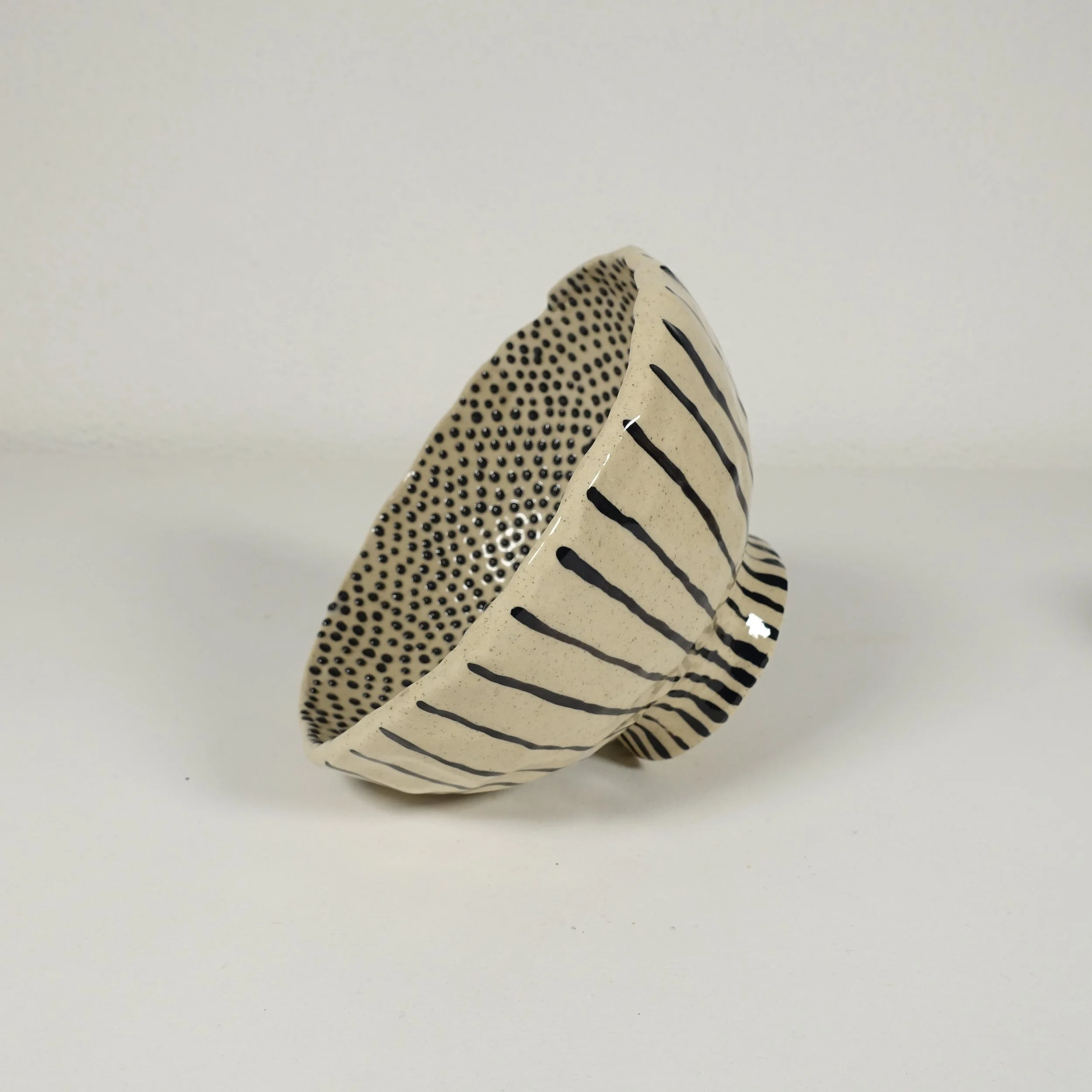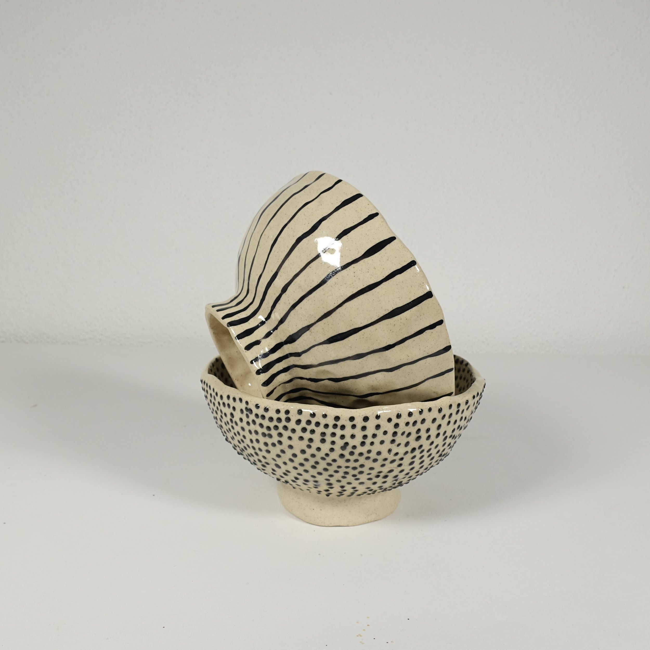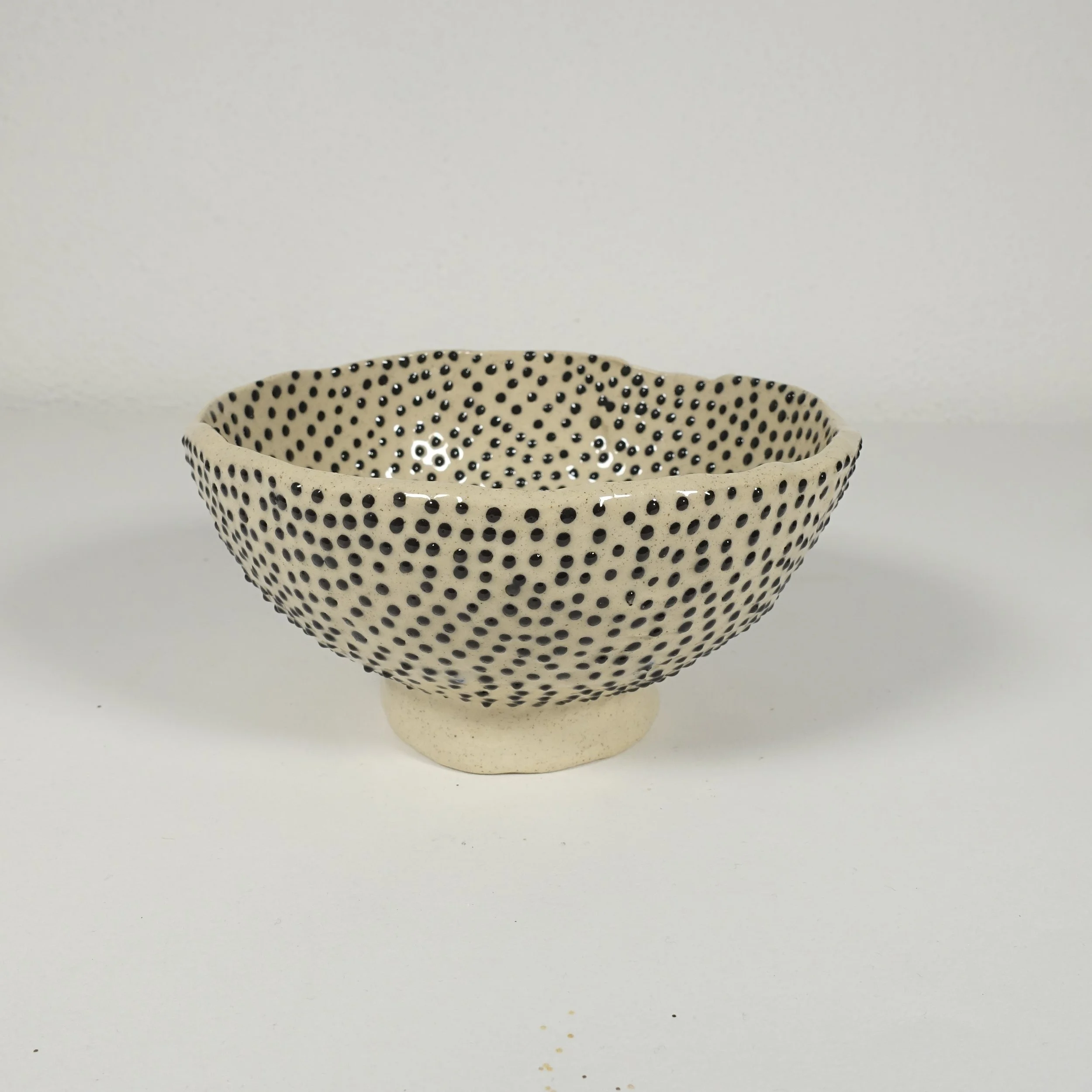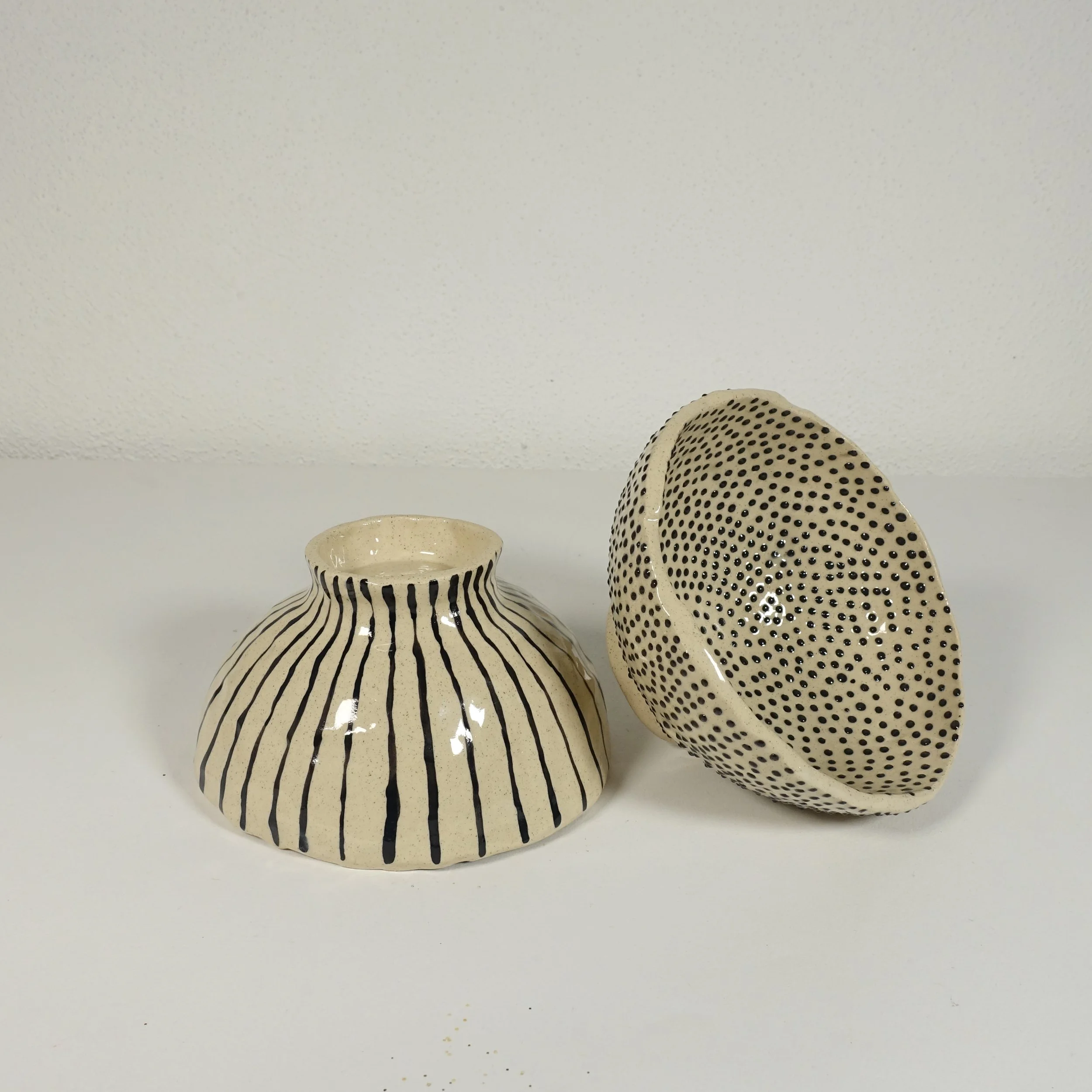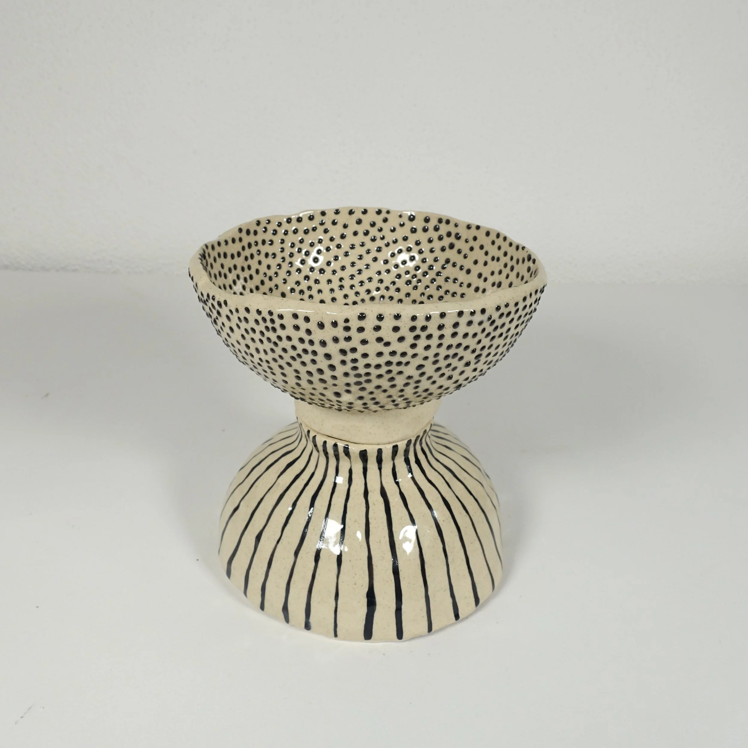 Realizzata completamente a mano in grès chiaro. Decorata con gocce di porcellana nera ed engobbi verde scuro, rosa e giallo.